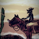 The cowbird rode atop her purple hipposteed across a vast desert with canyon walls rising high in the distance and a red sun shooting its rays through chemical clouds. Her silver stetson down low and a filter mask drawn tightly over her impressive beak, she tugged at the collar of her brown, beaten leather duster and kicked the spurs of her talon boots against the sides of her mount, urging her to continue their progress through a heat so thick, that it was like moving through a fog made up of coal dust.